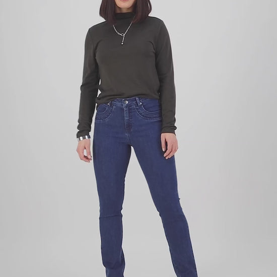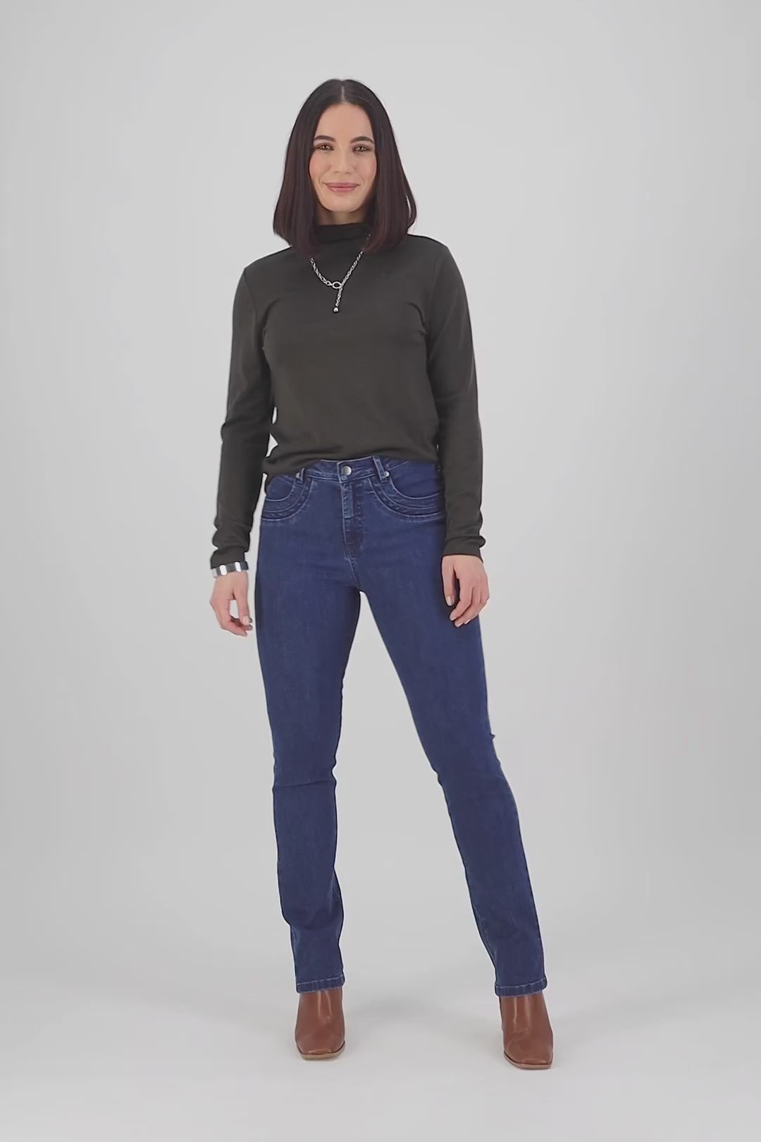 Details: High rise slim leg jean with a waistband featuring metal 'V' logo silver shank button closure, 2 front belt loops and 3 back belt loops. Zip fly. Two front cutaway pockets with silver 'V' logo rivets and triple seam detail. Front coin welt pocket on wearer's right-hand side with 'Vassalli' embroidery. Back patch pockets with seam detail. 'Vassalli' embroidery above wearer's right-hand back pocket.