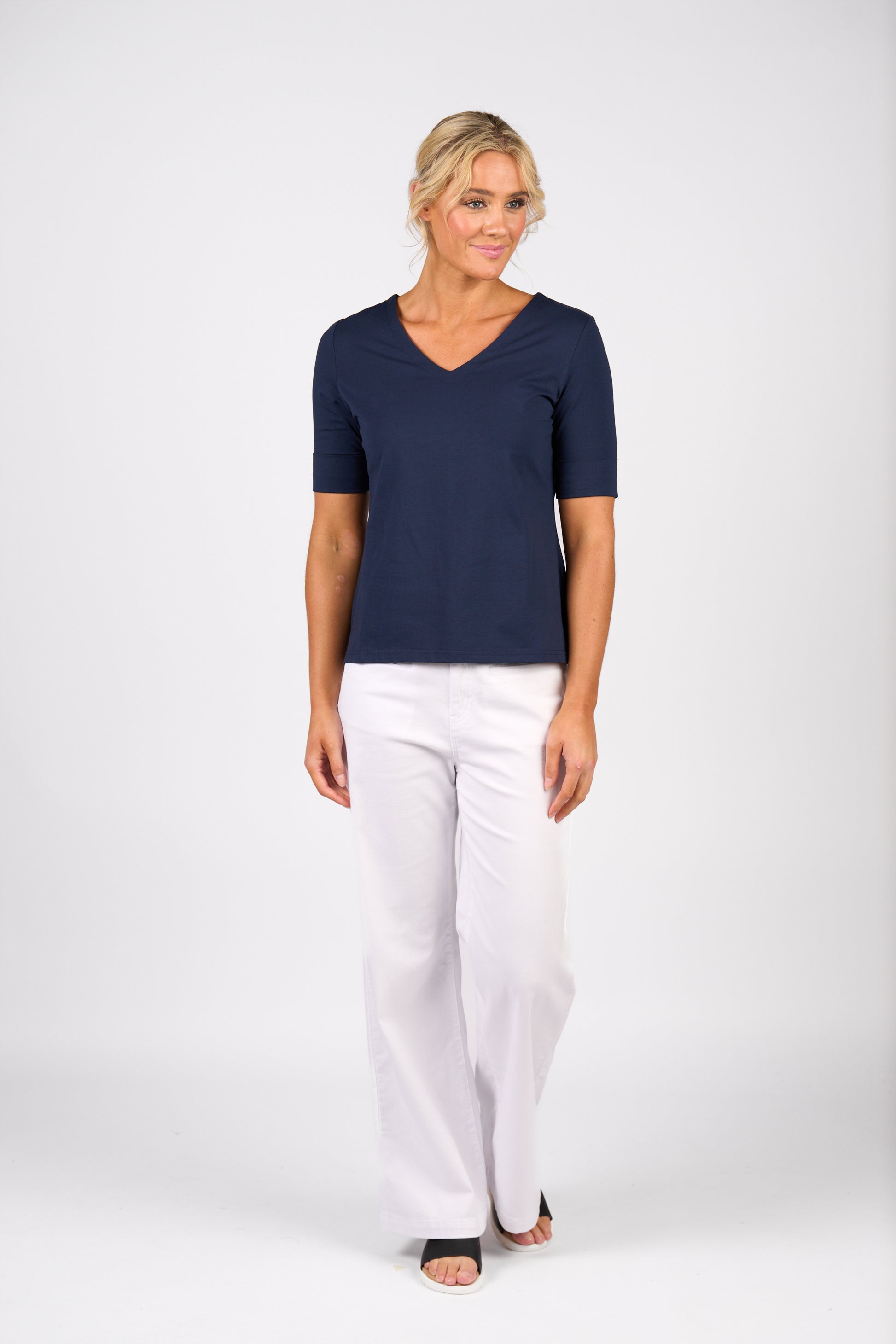 Vassalli V-Neck Top with Cuffed Sleeve in Navy
