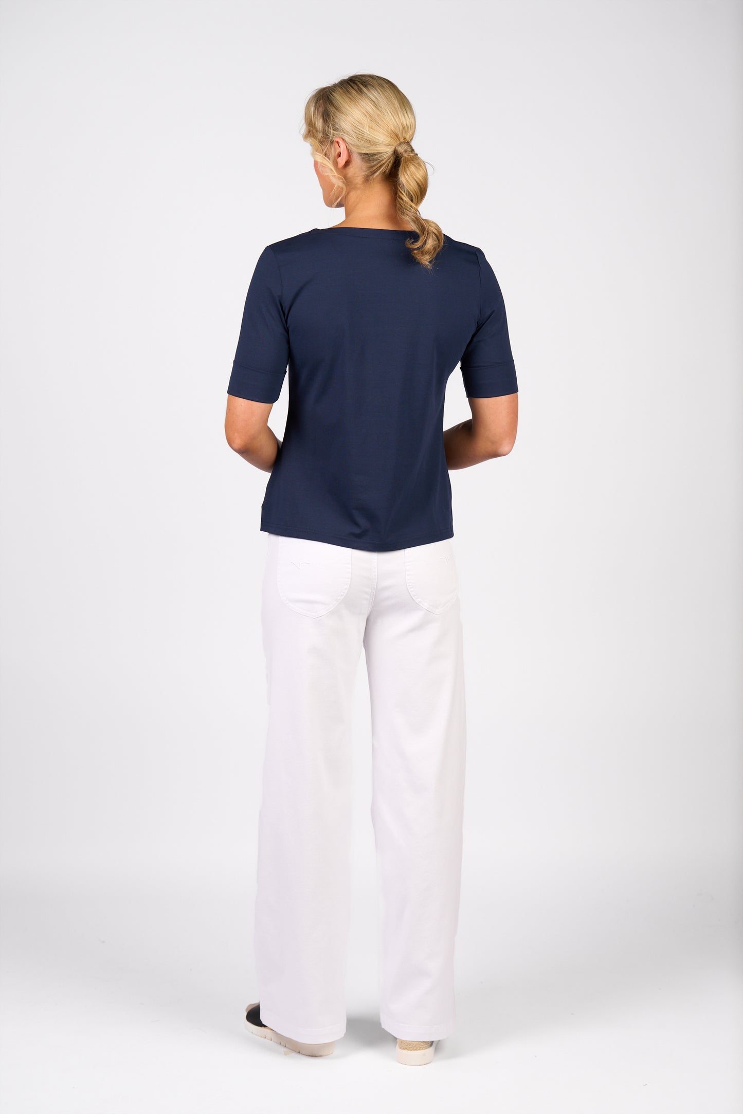 Effortless and versatile, the Navy Top by Vassalli is crafted from soft cotton-elastane jersey with natural stretch for easy comfort. Styled with a flattering V-neckline and relaxed silhouette, it’s a wardrobe staple designed for everyday ease.