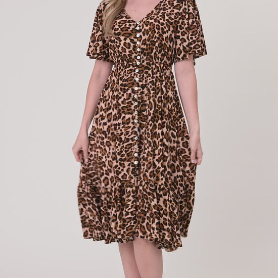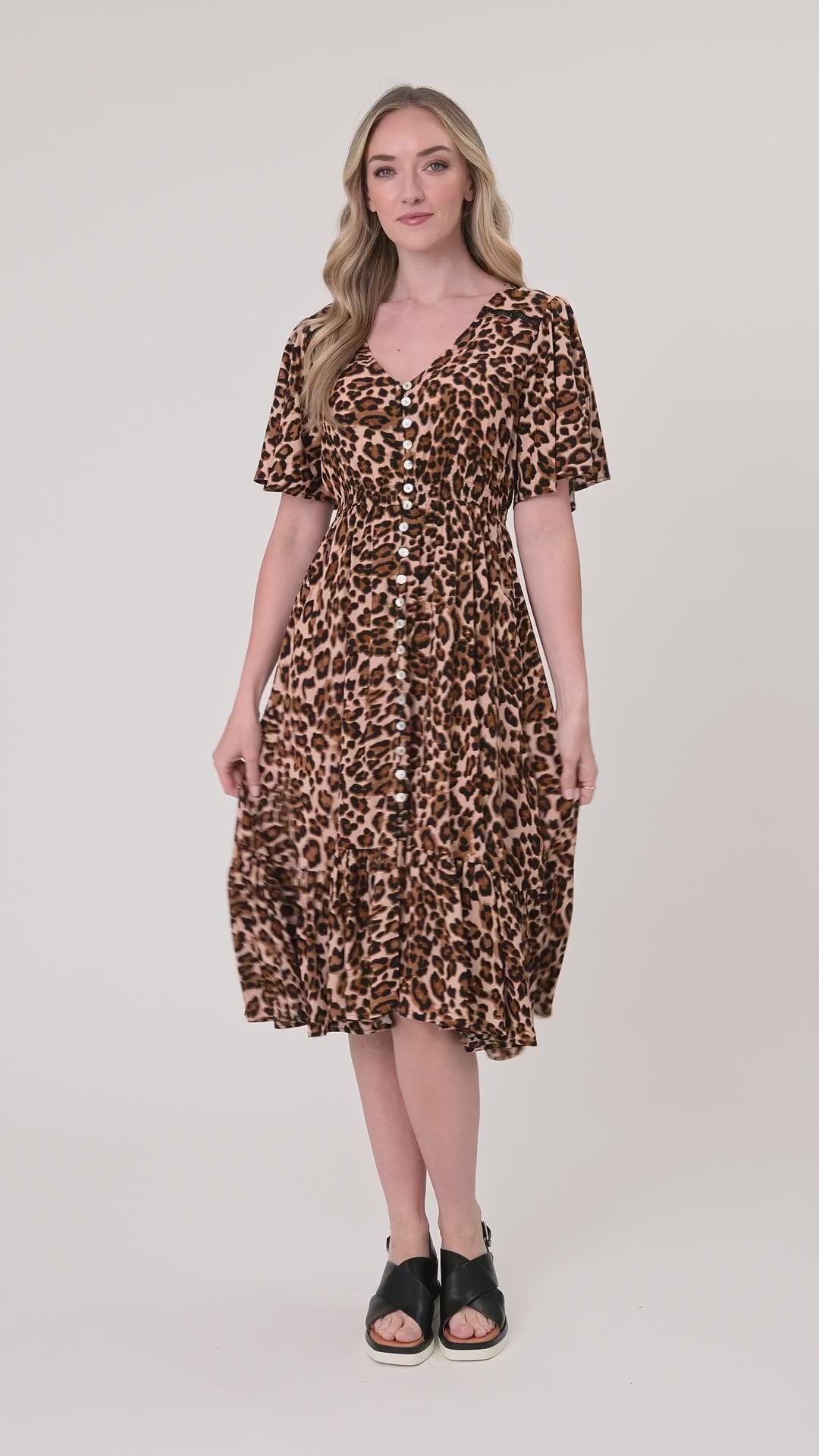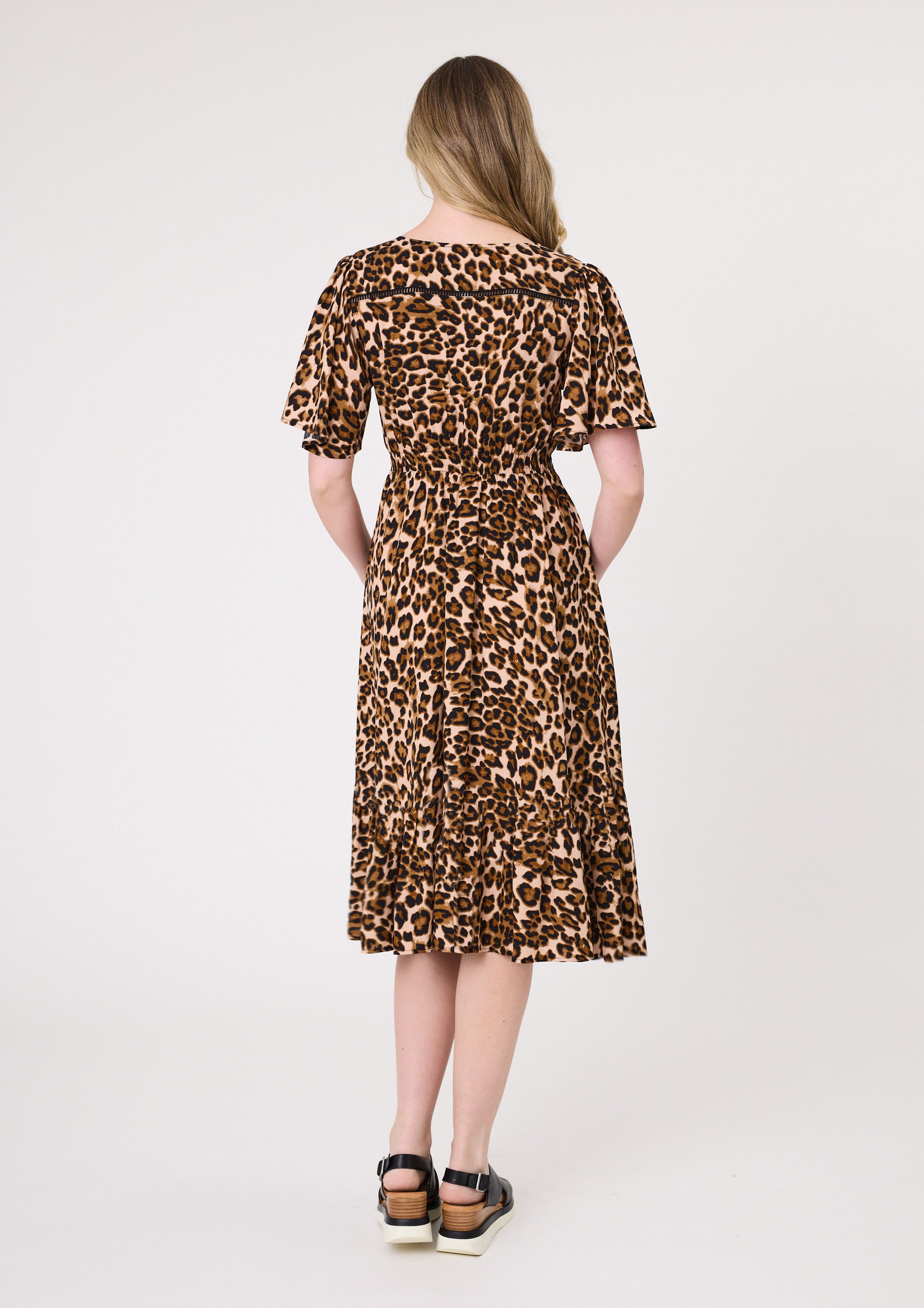All-over leopard printed dress with a flattering V-neckline and short flutter sleeves. Features black lace trimmings across the shoulder and mother of pearl button detailing on the front. Designed in a draped A-line silhouette for a soft, feminine shape. Made from 100% viscose for a breathable, flowy feel.