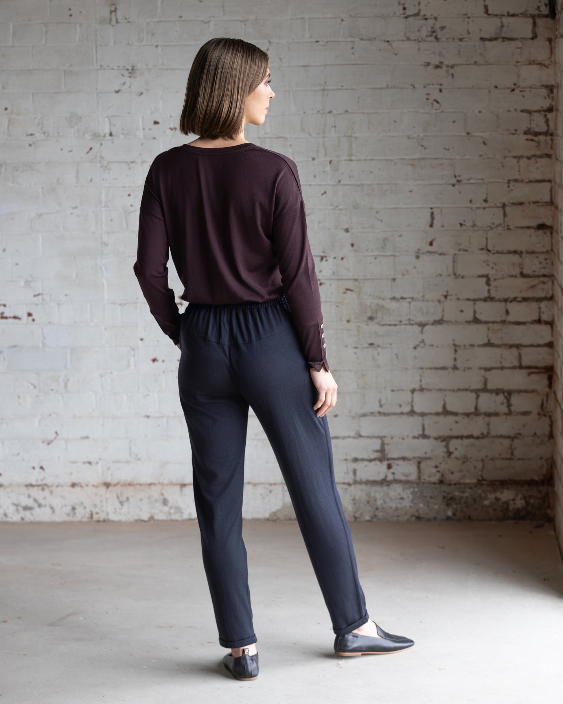 A casual merino pant, designed to balance soft comfort with a clean, streamlined silhouette. Featuring an easy pull‑on fit and a slim leg shape, this style delivers relaxed wearability with a polished finish, making it ideal for elevated everyday dressing or comfortable travel wear.
