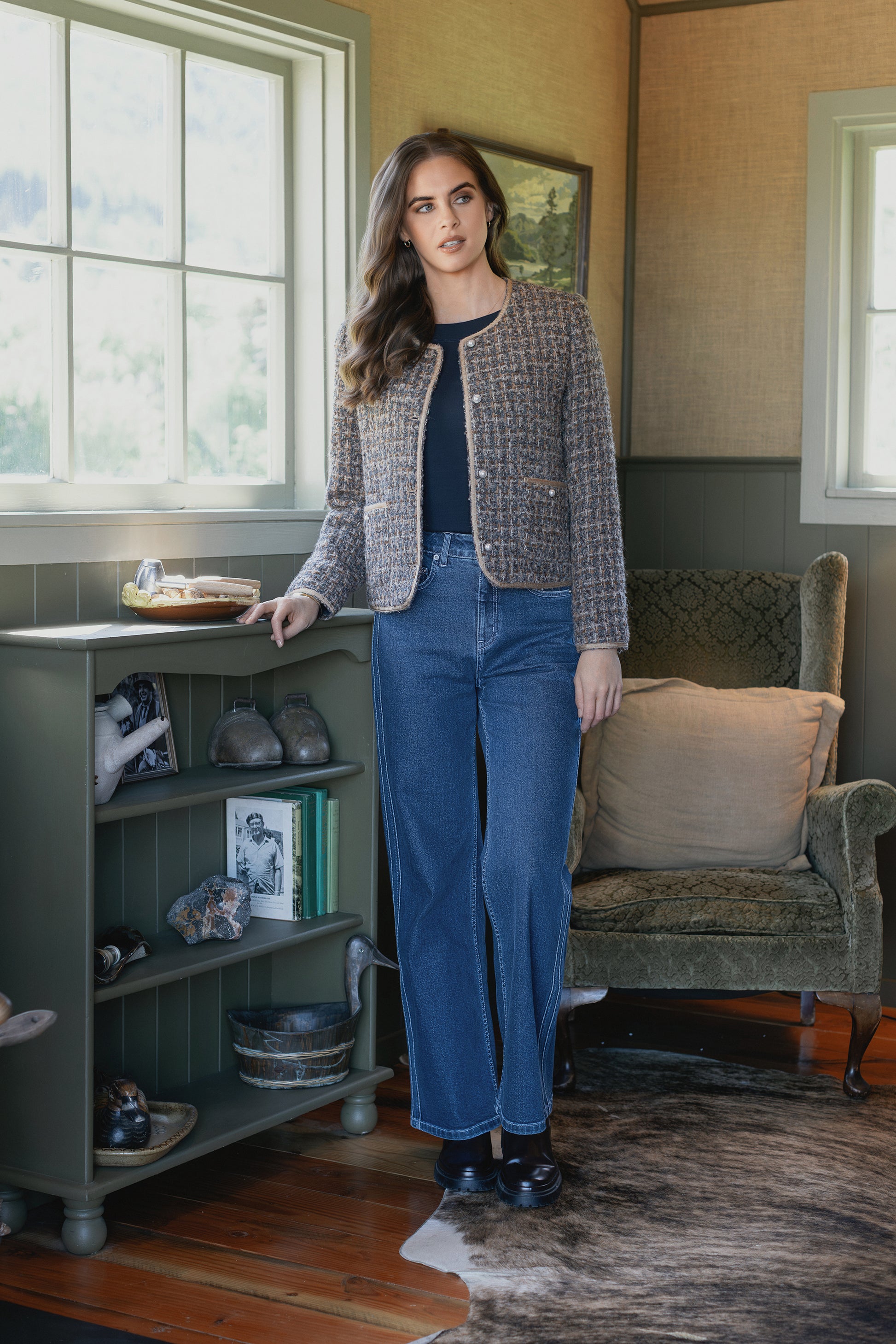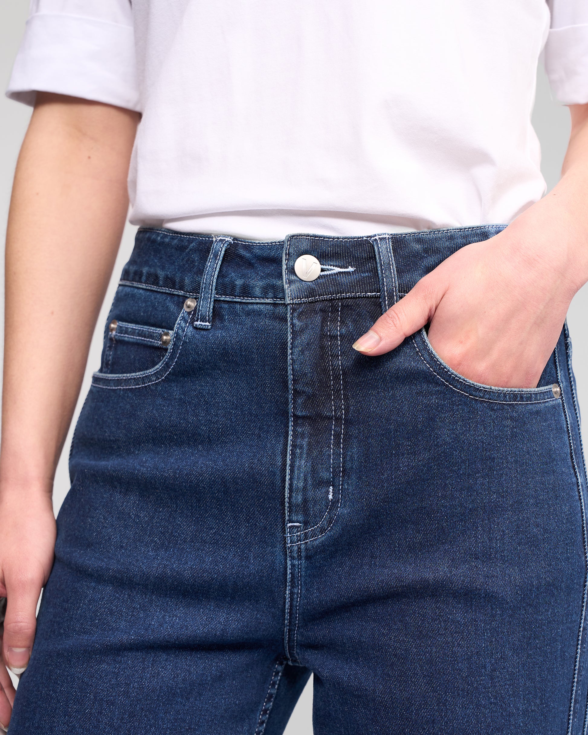 A wide‑leg, full‑length jean in a classic Dark Blue wash, designed with clean double seam detailing along the sides of each leg for an elongating, modern silhouette. Crafted from comfortable stretch denim, this style offers a flattering shape that works effortlessly for everyday wear. Finished with a metal ‘V’ logo jean button, belt loops, and a zip fly, it features back patch pockets and subtle ‘Vassalli’ embroidery above the right‑hand pocket for a refined branded touch.